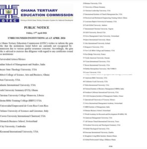 The Ghana Tertiary Education Commission (GTEC) has released a public notice listing 62 tertiary institutions it says are “currently not recognized” due to quality assurance concerns.