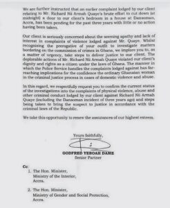 According to sources familiar with the letter, Ms. Quaye’s counsel want the police to state whether the complaints remain active, whether dockets have been forwarded to the Attorney-General’s Department for advice, and whether any charges have been filed or are pending. The letter also seeks confirmation of steps taken to ensure the safety of the complainant.